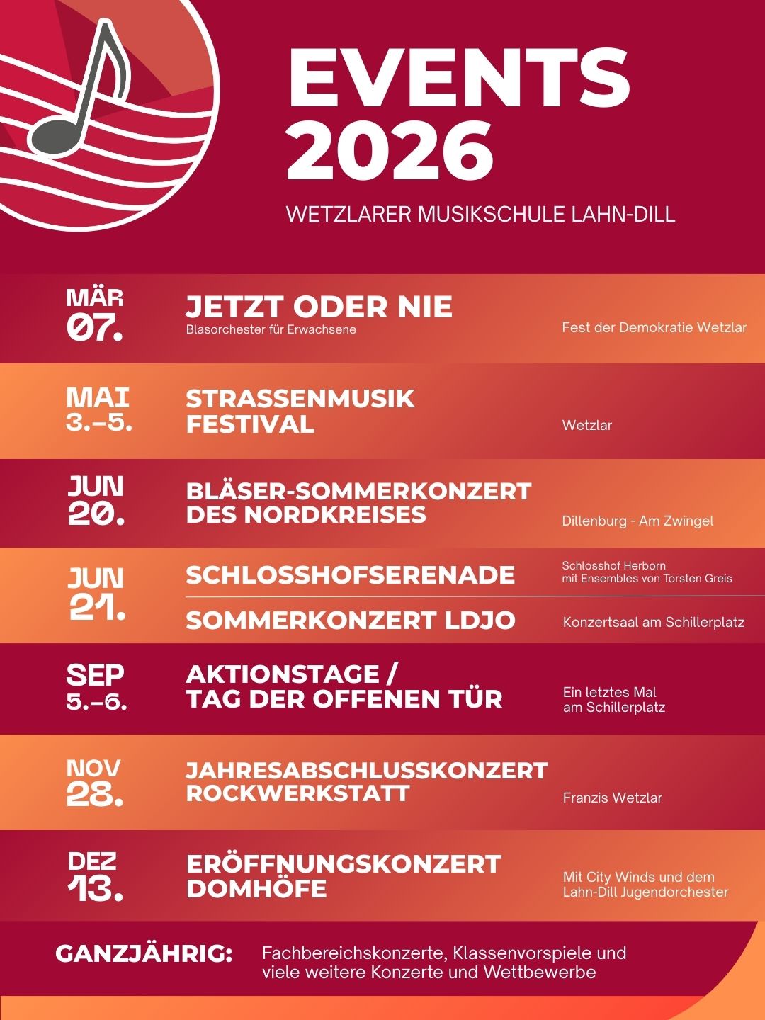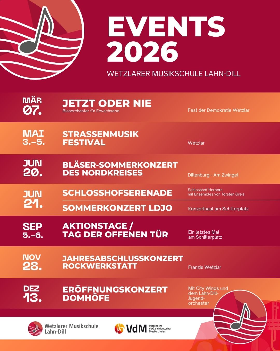 2026 wird musikalisch! Die Wetzlarer Musikschule Lahn-Dill ist auch im kommenden Jahr bei zahlreichen großen Veranstaltungen mit Live-Musik vertreten. Von Open-Air-Festivals über Sommerkonzerte bis hin zu feierlichen Abschluss- und Eröffnungskonzerten. ...