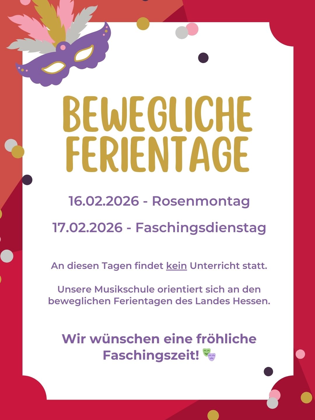 Liebe Schülerinnen und Schüler, liebe Eltern, an den beweglichen Ferientagen in Hessen findet kein Unterricht statt: Montag, 16.02.2026 – Rosenmontag Dienstag, 17.02.2026 – Faschingsdienstag Wir orientieren uns hierbei an den ...