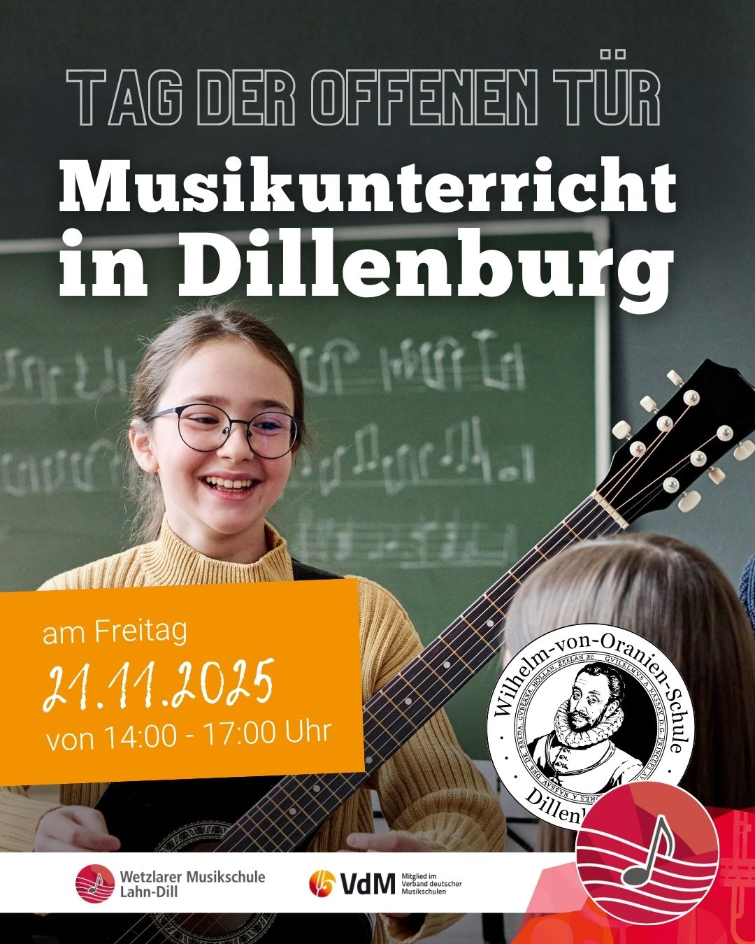 Tag der offenen Tür – Musik erleben an der Wilhelm-von-Oranien-Schule Am Freitag, den 21. November 2025, von 14:00 bis 17:00 Uhröffnet die Wilhelm-von-Oranien-Schule in Dillenburg ...