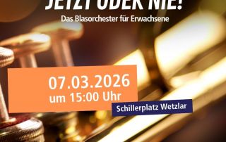 Das Blasorchester „Jetzt oder Nie!“ der Wetzlarer Musikschule Lahn-Dill ist am 7. März 2026 auf dem Schillerplatz zu erleben. Das Orchester ist Teil des Kulturprogramms beim "Fest der Demokratie". Anlass für das vom Demokratiebündnis Lahn-Dill veranstaltete Fest ist die Kommunalwahl am 15. März. Im letzten Jahr konnte das Blasorchester „Jetzt oder Nie!“ sein 10-jähriges Bestehen feiern. Seit der Gründung im Jahr 2015 finden sich engagierte, erwachsene Musikerinnen und Musiker regelmäßig zusammen, um gemeinsam zu proben und aufzutreten. In den vergangenen ...