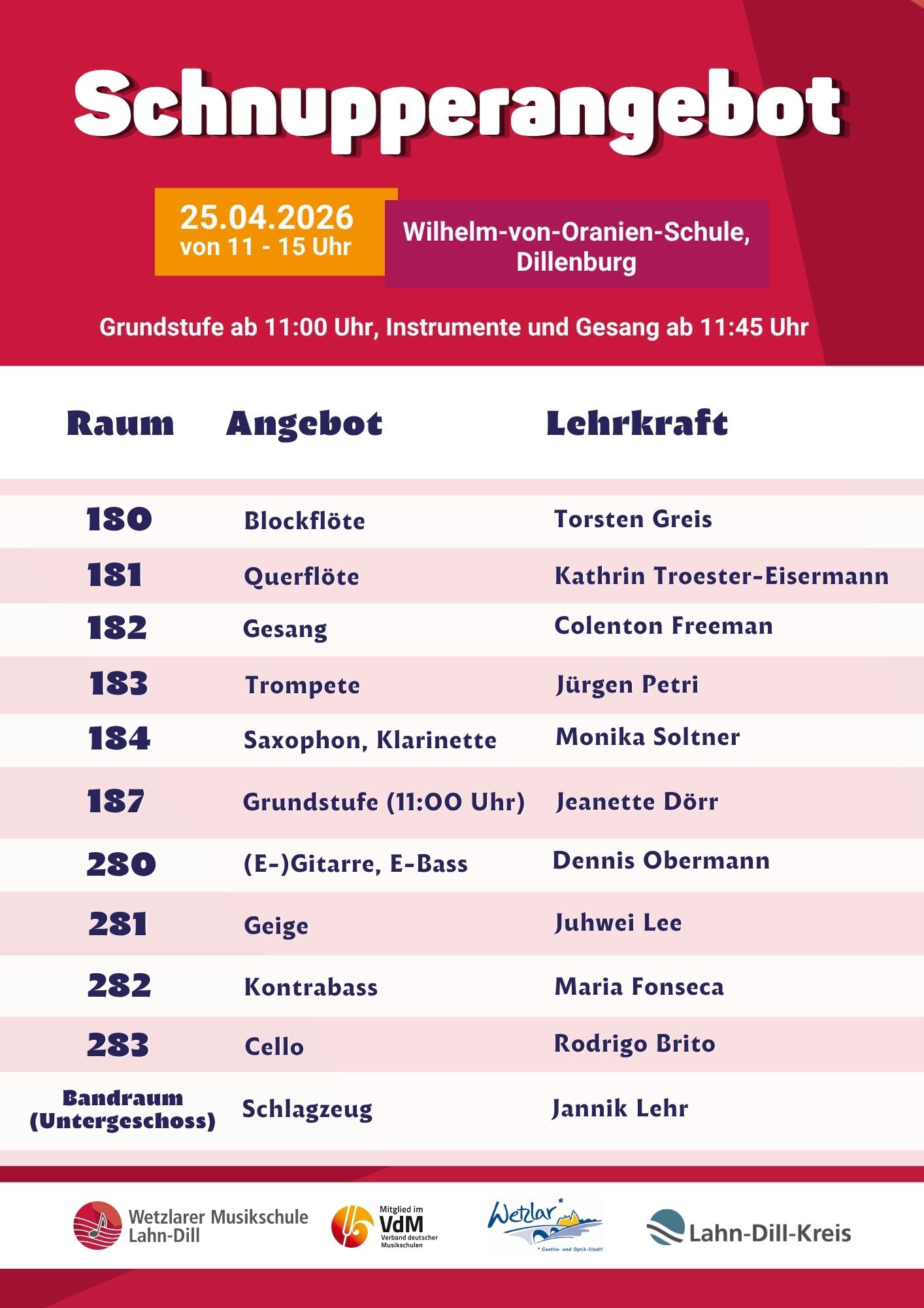 In insgesamt elf Räumen der Wilhelm-von-Oranien-Schule stehen unsere Lehrkräfte bereit, um die unterschiedlichsten Instrumente vorzustellen, die nicht nur in Dillenburg, sondern auch in Herborn oder Haiger angeboten werden. Egal ob jung oder alt, neugierig oder entschlossen – alle Besucherinnen und Besucher sind willkommen, sich umzuschauen, mitzumachen und sich inspirieren zu lassen.