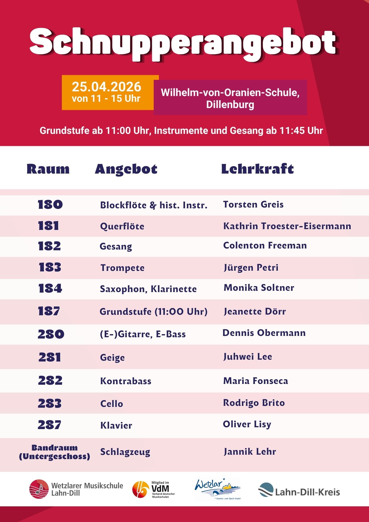 In insgesamt elf Räumen der Wilhelm-von-Oranien-Schule stehen unsere Lehrkräfte bereit, um die unterschiedlichsten Instrumente vorzustellen, die nicht nur in Dillenburg, sondern auch in Herborn oder Haiger angeboten werden. Egal ob jung oder alt, neugierig oder entschlossen – alle Besucherinnen und Besucher sind willkommen, sich umzuschauen, mitzumachen und sich inspirieren zu lassen.