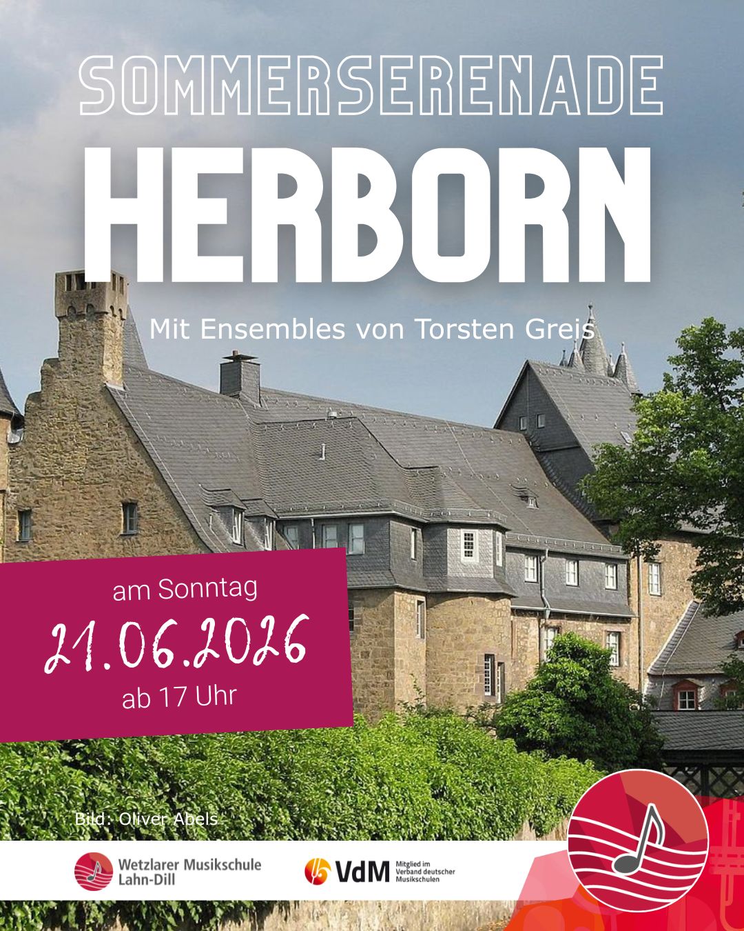 Schloss Herborn Nassaustraße/Kirchberg, HerbornSommerserenade im Schlosshof Herborn mit Ensembles von Torsten Greis Die Sommerserenade lädt in den Herborner Schlosshof ein: Schöne Musik unter freiem Himmel – und das ganze vor der phantastischen Kulisse des Herborner Schlosses: Die Herborner Kantorei veranstaltet am Sonntag, 21. Juni 2026 von 17 bis 20 Uhr wieder eine "Sommerserenade".