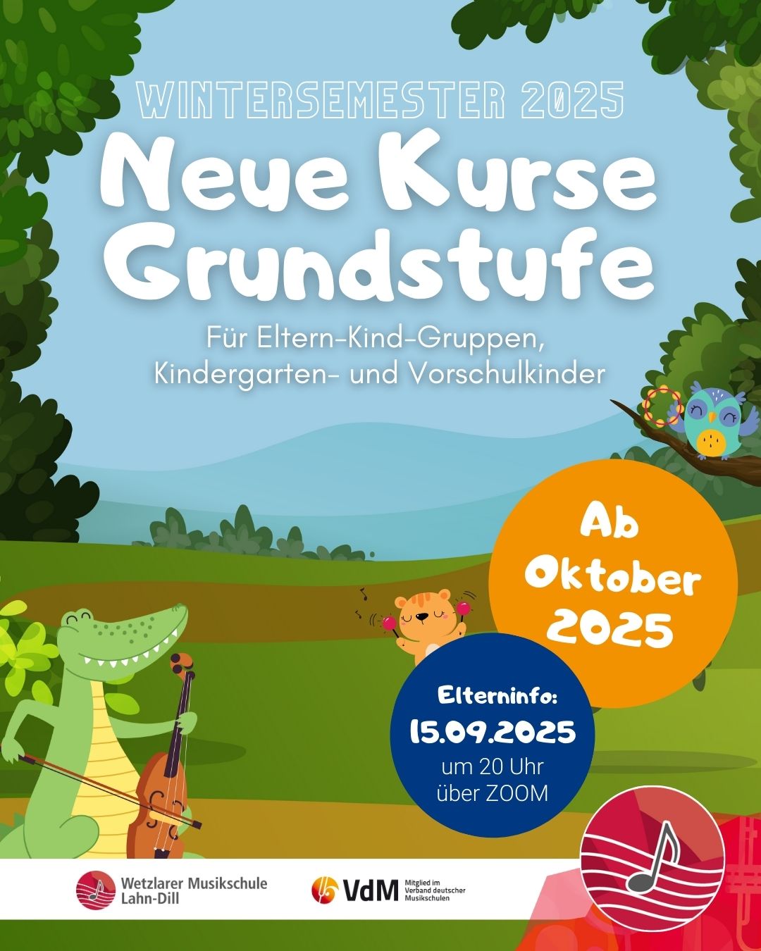 ZoomWir freuen uns, Ihnen mitteilen zu können, dass wir erneut einen Eltern-Informationsabend für unsere musikalischen Angebote für Kinder von 20 Monaten bis 6 Jahren veranstalten werden. An diesem Abend werden Ihnen unsere Fachkräfte nähere Informationen zu neuen Kursen und freien Plätzen in unserem Haus der Musik am Schillerplatz und im gesamten Lahn-Dill Kreis geben. Vorab können Sie sich gerne auf unserer Homepage über unsere Angebote und deren Standorte informieren. Den Einladungslink empfangen Sie auf Anfrage per E-Mail oder nach dem ...